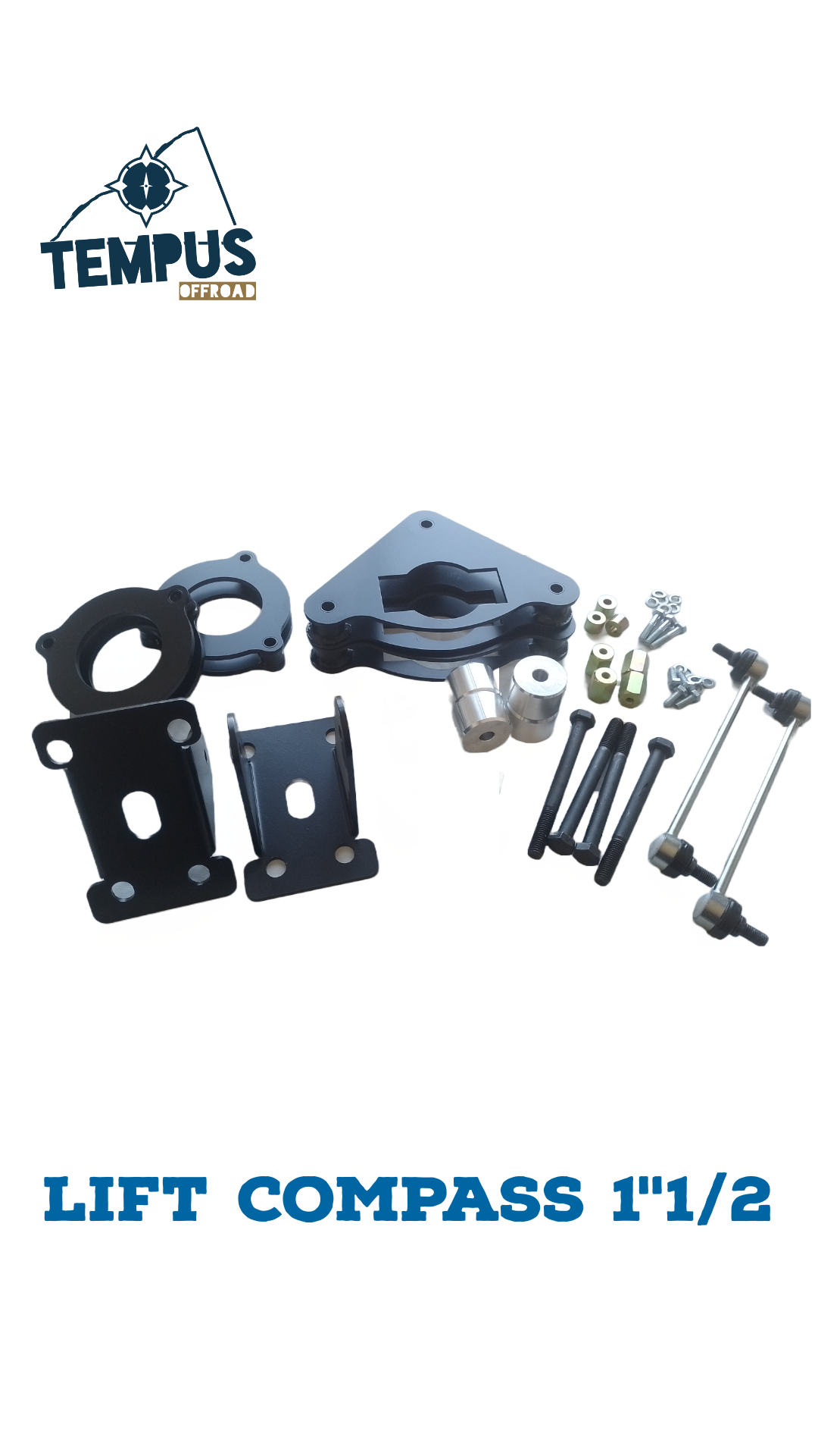 Kit lift Renegade/Compass 4x2 1"1/2 composto de: 02 prolongadores para a torre de suspensão dianteira em aço; 02 prolongadores para a torre da suspensão traseira em aço; 02 bieletas para a barra estabilizadora dianteira; 04 calços do agregado traseiro em alumínio; 04 parafusos para o agregado; 02 calços para o escapamento em alumínio; 02 calços para a linha de freio traseira em alumínio; 02 suportes para o braço da suspensão traseira; 03 espaçadores da proteção do tanque.